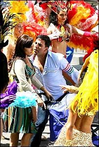 شکیرا ممبئی میں اطالوی گلوکارہ اور رقاصہ شکیرا کی دھنوں پر اب ممبئی رقص کرے گا۔ شکیرا تئیس مارچ کو ممبئی آنے والی ہیں۔ کوریوگرافر فرح خان جو شکیرا کو انڈین رقص سکھا چکی ہیں، انہیں اپنے دوست شاہ رخ خان کے بنگلہ میں مدعو کریں گی۔ دیکھتے ہیں کون کس کو متاثر کرنے میں کامیاب ہوتا ہے۔۔۔!کنگ خان کی لنگی جب سے کنگ خان ’ کون بنے گا کروڑ پتی‘ شو کر رہے ہیں روز کوئی نہ کوئی لطیفہ ہوتا ہے۔ہاٹ سیٹ پر ان کے سامنے کیرلا کے مہمان تھے۔ وہ اپنے روایتی انداز میں لنگی پہن کر آئے تھے۔ انہوں نے خان کو بطور تحفہ لنگی پیش کی۔ بس کیا تھا خان صاحب اسے سنبھال کر رکھنے کے بجائے سیٹ پر پہن کر آگئے۔ اس کے بعد سیٹ پر جو قہقہے چھوٹے وہ کہنے کی ضرورت نہیں۔ اتنے سنجیدہ ماحول کو ہلکا پھلکا بنادینا کنگ خان کے بس میں ہی ہے۔ پریہ کی ڈانٹ فلم ’دھول‘ کا سیٹ لگا تھا۔ ہیروئن تنو شیردتہ اپنی میک اپ وین میں دو گھنٹہ سے میک اپ کر رہی تھیں۔ فلم کا پہلا شاٹ تھا اور تنو چاہتی تھیں کہ پریہ درشن پر ان کا پہلا تاثر اچھا رہے۔ تیار ہو کر دتہ سیٹ پر پہنچیں اور انتظار تھا کہ درشن انہیں دیکھ کر تعریف کرتے کہ درشن سب کے سامنے چیخنے لگے۔ دتہ کو انہوں نے ڈانٹا کہ یہ کیا ہے، اتنا میک اپ کس نے لگانے کے لیے کہا جاؤ اور اسے صاف کر کے آؤ۔ دتہ کے سارے سپنے ٹوٹ گئے اور دو گھنٹوں کا میک اپ پندرہ منٹ میں صاف ہو گیا۔ جیا خان کی پریشانی فلم ’نی شبد‘ کی جیا خان آج کل بہت پریشان ہیں۔ اس لیے نہیں کہ انہیں شادی کے پیغامات موصول ہو رہے ہیں بلکہ اس لیے کہ دنیا کے مختلف حصوں سے انہیں جو پیغامات مل رہے ہیں اس میں کہا جا رہا ہے کہ جب وہ ساٹھ سال کے بوڑھے کے ساتھ پیار کر سکتی ہیں تو پھر ان میں کیا برائی ہے۔اب جیا اپنا فون نمبر اور ای میل ایڈرس بدلنے پر غور کر رہی ہیں۔ قطرینہ کا لاکٹ ہر فلم سٹار اپنے گلے میں یا جسم پر کوئی ایسا زیور پہنتا ہے جسے وہ اپنے لیے لکی سمجھتا ہے۔ اپنے سلو بھیا کی مثال لے لیجئے۔ ان کے ہاتھ میں ایک بریسلیٹ ہے جسے وہ کبھی نہیں اتارتے۔ اب ان کی گرل فرینڈ قطرینہ کیف نے اپنے گلے میں ایک لاکٹ پہننا شروع کر دیا ہے جس پر اردو میں اللہ لکھا ہےاور یہ لاکٹ ہیروں سے جڑا ہے۔ ہم دعا کرتے ہیں کہ قطرینہ کے لیے یہ لاکٹ لکی ثابت ہو۔  | | | ودیا بالن اور اکشے کمار ایک ساتھ فلم ’ہے بی بی‘ میں کام کر رہے ہیں |