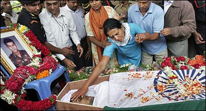 ممبئی میں شدت پسندوں اور سکیورٹی فورسز کے درمیان اینکاؤنٹر میں ہلاک ہوئے انسداد دہشتگردی دستے یعنی اے ٹی ایس کے چیف ہیمنت کرکرے، نیشنل سکیورٹی گارڈز کے میجر سندیپ اننی کرشن اور کمانڈو گجیندر سنگھ کو سنیچر کی دوپہر کو قومی اعزاز کے ساتھ خراج عقیدت پیش کی گئی۔ جنازے کے سفر ميں سڑک کے دونوں طرف سینکڑوں کی تعداد ميں لوگ ان اہلکاروں کو الوداع کہنے کے لیے کھڑے تھے۔ ممبئی حملوں میں 170 سے زیادہ افراد ہلاک اور 370 سے زیادہ افراد زخمی ہوئے تھے۔ اس کے علاوہ شدت پسندوں کے ساتھ تصادم میں 14 سکیورٹی فورسز بھی ہلاک ہوئے تھے۔ اے ٹی ایس کے چیف چھبیس نومبر کی رات شدت پسندوں کی جانب سے کی گئی فائرنگ ميں ہلاک ہوئے تھے۔ اے ٹی ایس کے سربراہ ہیمنت کرکرے مالیگاؤں کیس کی تحقیقات میں مصروف تھے اور انہیں کچھ روز سے دھمکیاں موصول ہو رہی تھیں۔ مالیگاؤں دھماکے کی تفتیش کے دوران سادھوی پرگیا سنگھ، لفٹیننٹ کرنل پرساد پروہت سمیت دو افراد کو گرفتار کیا تھا۔ کر کرے سات برس تک ہندوستان کی خفیہ ایجنسی راء میں رہے تھے اور اسی برس جنوری میں انہيں اے ٹی ایس کا چیف مقرر کیا گیا تھا۔ 31 سالہ میجر اننی کرشن سنیچر کی صبح تاج ہوٹل میں شدت پسندوں کے خلاف کاروائی میں مارے گئے تھے۔ وہ گزشتہ دو برس سے بلیک کیٹ کمانڈو فورس میں تھے۔ ممبئی کے ناریمن ہاؤس میں شدت پسندوں کے ساتھ تصادم میں مارے گئے این ایس جی کے ہولدار گجیندر سنگھ کا جنازہ ان کے آبائی وطن دہرادون لے جانے سے پہلے دلی لایا گیا تھا۔ گجیندر سنگھ 51 ویں سپیشل ٹاسک فورس کے ممبر تھے۔ |