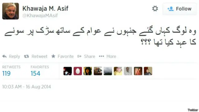 وزیر دفاع اور مسلم لیگ کے رہنما خواجہ آصف جو ٹوئٹر پر کبھی کبھی کبھار نظر آتے ہیں نے ٹویٹ کی کہ ’ وہ لوگ کہاں گئے جنہوں نے عوام کے ساتھ سڑک پر سونے کا عہد کیا تھا؟؟؟‘
