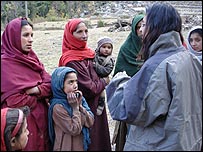 ہمارے مترجم جو کہ ایک سکول ٹیچر ہیں مقامی خواتین سے باتیں کر رہے تھے۔ انہیں پتہ چلا کہ تقریباً تین سو میٹر نیچے ایک عورت زخمی پڑی ہے۔ ان کے مطابق اس کی ٹانگ زخمی ہے اور اسے زلزلے کے بعد کوئی مدد نہیں ملی ہے۔ لگ بھگ پینتالیس منٹ بعد ہم اس عورت تک پہنچے۔ اس کی ٹانگ بہت بری طرح زخمی تھی۔ مجھ سے جو کچھ ہو سکا میں نے کیا، اس کی چارپائی کے پائے کاٹے اور اسے واپس اوپر لے کر آئے۔ کل ہم اسے مظفرآباد لے جائیں گے۔
