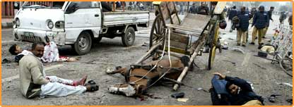 ’میرے آفس سے دو سو ميٹر کے فاصلے پر آج صبح ٹھيک گيارہ بجکر چاليس منٹ پر يہ دھماکہ ہوا اور اس قدر خوفناک و اونچی آواز آئی کہ لگتا تھا بھارت نے حملہ کرديا ہے۔ دروديوار تک ہل کر رہ گئے اور ہمارے دفتر کے تمام سٹاف ميں بھگڈر سی مچ گئي۔ تين منٹ بعد دفتر سے باہر آيا تو جائے وقوعہ کا علم ہوا جو کہ جي پي او چوک پر لاہور ہائي کورٹ کے گيٹ کے ساتھ واقع اوقاف کی بلڈنگ کے پارک کے ساتھ باہر سڑک پر تھي۔ میں نے جائے وقوعہ پر اندازاً سات سپاہيوں اور تين سويلينز کی جلی پھٹی لاشوں کو ديکھا تو متلي، افسوس، بےبسي، کم مائيگي، مايوسی اور حيرانگی جيسے جذبات و احساسات کی ملی جلی کيفيت نے ميري طبيعت پر حملہ کر ديا کہ پاکستان ميں يہ کيا ہو رہا ہے! کچھ لاشوں کے ٹکڑے ملحقہ دفاتر کی حدود میں گرے ہوئے بھی ديکھے۔ دھماکہ کے بعد ايک ليسکو کی وين، ايک رکشہ، تين کاريں، دو موٹرسائيکل، ايک مزدا ويگن اور ايک تانگہ گھوڑا تباہ ہوئے۔ عين موقعہ پر میں نے بی بی سی سے بذريعہ موبائل فون رابطہ کرنے کی کوشش بھی کی تھی ليکن موبائل سروس نے کام کرنا چھوڑ ديا تھا۔ قريباً پندرہ منٹ بعد ريسکيو اور پوليس کی بھاری نفری وہاں پہنچ گئی اور لوگوں کو منتشر کرنے کے لیے آنسوگيس استعمال کی جس سے میں بھی متاثر ہوا۔ تباہ شدہ املاک میں سب سے بُری حالت تانگہ کی ديکھی اورگھوڑا بھي مرگيا تھا لہذا ميری دانست ميں خودکش حملہ آور نے سپاھيوں کے کھڑے ہونے والے فٹ پاتھ پر تانگہ رکوايا اور خود کو دھماکہ سےاڑا ديا۔‘ نجیب الرحمان ہماری ویب سائٹ کے قاری ہیں اور دھماکے کے وقت وہاں موجود تھے۔ یہ ان کا آنکھوں دیکھا حال ہے۔ |