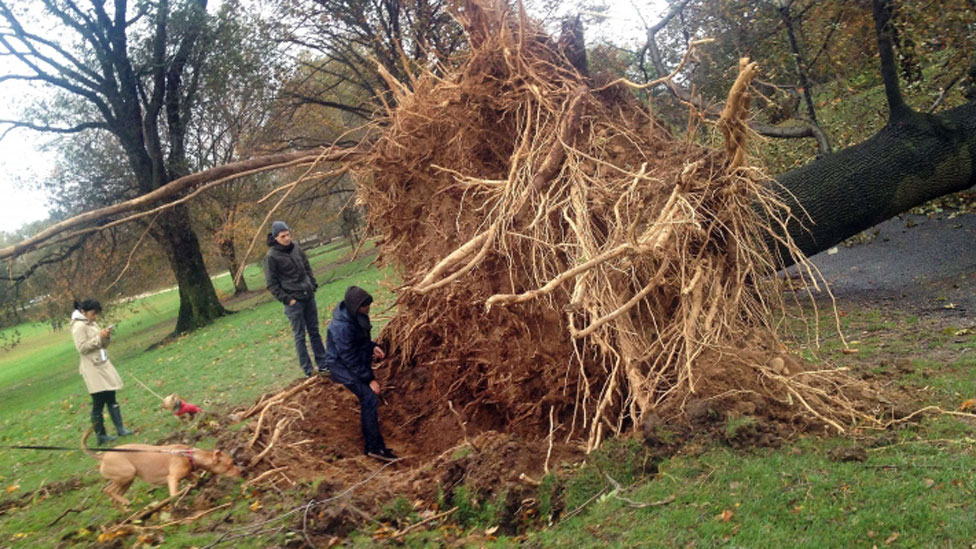 • نیویارک کے علاقے بروکلن میں ایک خاندان پیڑ کو دیکھ رہا ہے جو طوفان کےسبب جڑ سے اکھڑ گیا۔