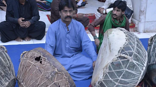 ’میں نے دو سال کی عمر سے والد کی گود میں بیٹھ کر بجانا شروع کیا، میرے چار بیٹے اور سات بھائی ہیں سارے ہی بجاتے ہیں۔ عام دنوں میں جیسے آدھا گھنٹہ ہوتا ہے ابتدا میں کرتا ہوں اس کے بعد دس منٹ چھوٹا بھائی اور اگلے دس منٹ دوسرا بھائی بجائے گا جبکہ ایک گھنٹے کے دھمال میں آدھا گھنٹہ میں بجاتا ہوں جبکہ آدھا گھنٹہ بھائی بجاتے ہیں۔‘
