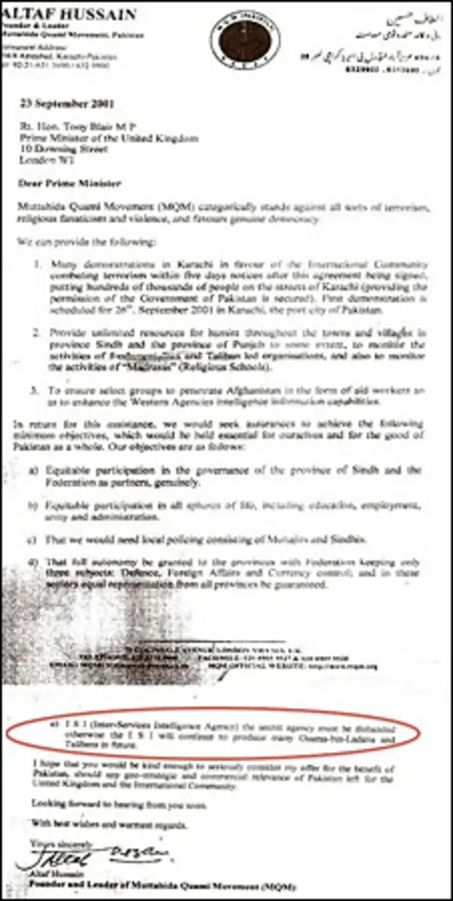 پاکستان کے صوبہ سندھ کے سابق سینیئر وزیر اور پیپلز پارٹی کے رہنما ذوالفقار مرزا نے کراچی میں منعقدہ ایک پریس کانفرنس میں جہاں ایم کیو ایم اور وزیرِ داخلہ کو شہر کے حالات کی خرابی کا ذمہ دار قرار دیا وہیں ایک ایسے خط کا ذکر بھی کیا جس میں مبینہ طور پر متحدہ قومی موومنٹ کے قائد الطاف حسین نے برطانوی وزیراعظم سے کہا تھا کہ پاکستان کی خفیہ ایجنسی آئی ایس آئی کا خاتمہ ضروری ہے ورنہ یہ ایجنسی اسامہ اور طالبان پیدا کرتی رہے گی۔