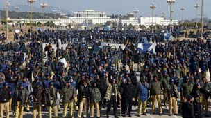 طاہر القادری کا ’جمہوریت مارچ‘ اتوار کی دوپہر لاہور سے شروع ہوا تھا اور وہ تقریبًا چھتیس گھنٹے کے سفر کے بعد پیر کو رات گئے مارچ کے ہزاروں شرکا کے ہمراہ اسلام آباد میں پارلیمان کی جانب جانے والی سڑک جناح ایونیو پر پہنچے جہاں جلسے کا انتظام کیا گیا تھا۔