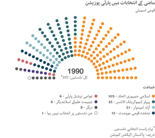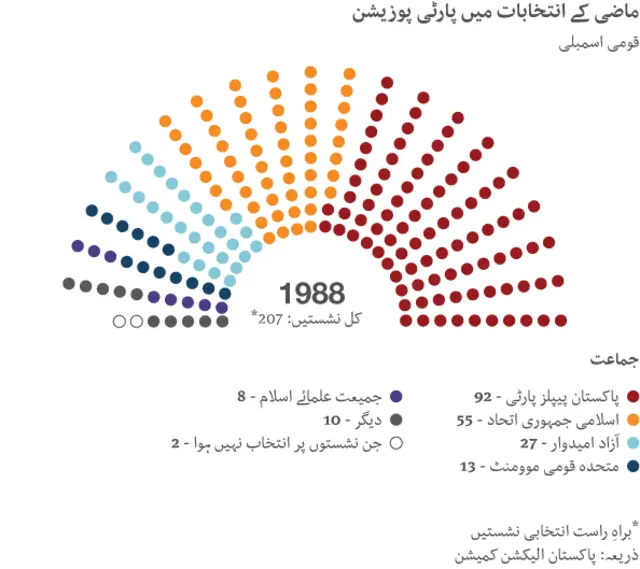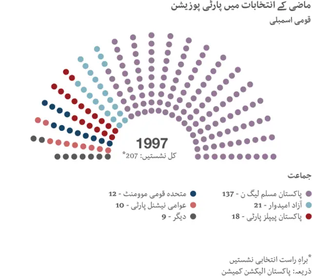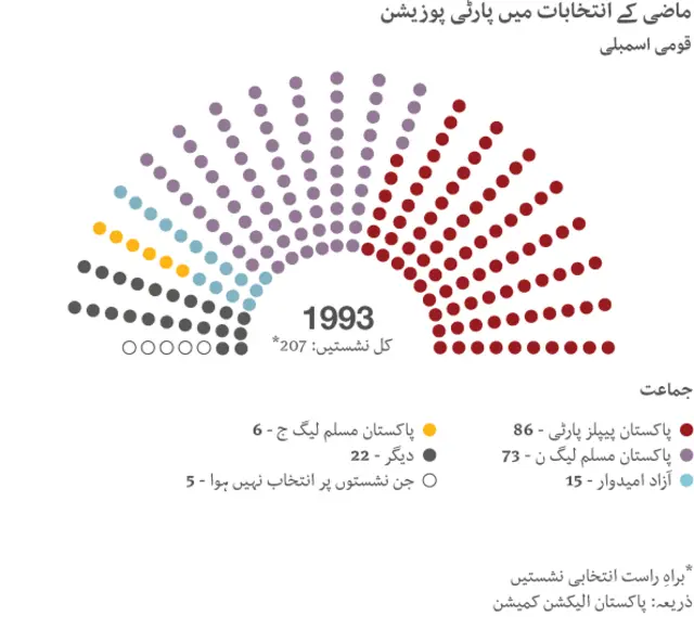 پاکستان میں گزشتہ پچیس برس کے دوران ملک میں چھ مرتبہ انتخابات ہوئے جن کے نتائج کے مطابق پارٹی پوزیشن کچھ یوں تھی۔