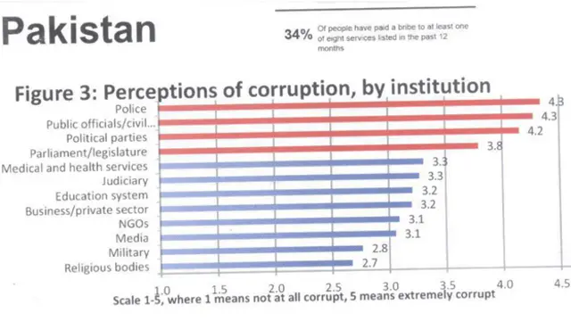 ٹرانسپرنسی انٹرنیشنل نے گلوبل کرپشن بیورومیٹر کے نام سے جاری کی گئی تحقیقی رپورٹ میں کہا ہے کہ پاکستان میں پولیس میں سب سے زیادہ بدعنوانی دیکھی گئی ہے، جس کے بعد شہری اداروں، سیاسی جماعتوں،پارلیمامینٹرین، صحت کے شعبے، عدلیہ، تعلیم اور پرائیوٹ سیکٹر میں کرپشن موجود ہے۔