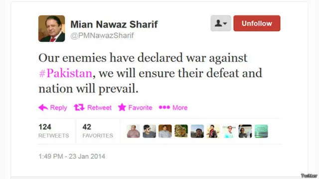 میاں نواز شریف کی اگلی ٹویٹ اور بھی اہم تھی۔ اس میں کہا گیا تھا: ’ہماری افواج پر حملہ پاکستان کے خلاف جنگ کا اعلان ہے اور ہم اس کا جواب دیں گے۔ ہماری بات چیت کی پالیسی کا دہشت گردوں نے غلط مطلب لیا ہے۔‘