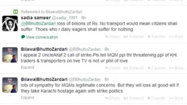 بلاول زرداری نے اپنے پیغامات میں کہا ہے کہ انہیں ایم کیو ایم کے جائز خدشات سے ہمدردی ہے تاہم ایم کیو ایم کراچی میں اپنی حمایت کھو دے گی اگر وہ ہڑتالی سیاست سے شہر کو یرغمال بنا لیں گے۔