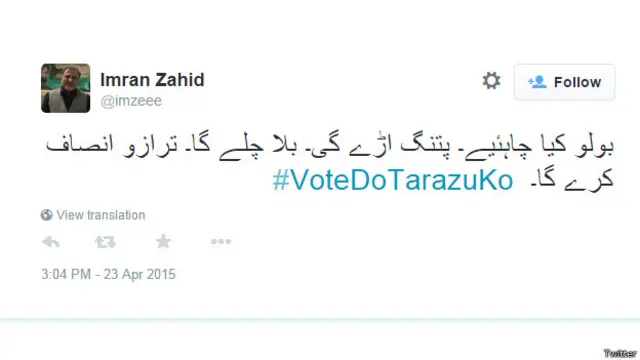 عمران زاہد لکھتے ہیں: ’بولو کیا چاہیے۔ پتنگ اڑے گی۔ بلا چلے گا۔ ترازو انصاف کرے گا۔‘