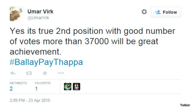 پاکستان تحریک انصاف کے حامی عمر ورک لکھتے ہیں کہ ’ہاں یہ سچ ہے کہ 37000 ووٹوں کے ساتھ دوسری پوزیشن حاصل کرنا ایک بڑی کامیابی ہو گی۔‘ وہ مزید لکھتے ہیں کہ ’آج جو تبدیلی عزیز آباد میں آ رہی ہے اس کے لیے عمران خان نے 17 سال محنت کی ہے۔‘