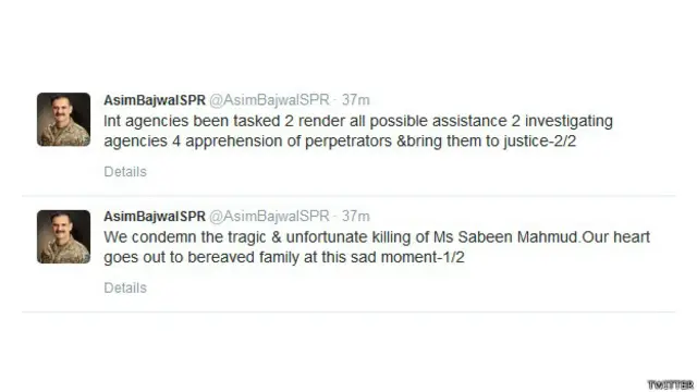 پاکستانی فوج کے شعبہ تعلقاتِ عامہ آئی ایس پی آر کے ترجمان میجر جنرل عاصم باجوہ نے سماجی رابطوں کی ویب سائٹ ٹوئٹر پر جاری بیان میں سبین محمود کے قتل کی مذمت کی ہے۔