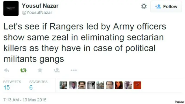 یوسف نذر نے لکھا کہ ’دیکھتے ہیں کہ رینجرز جن کی قیادت فوجی افسران کر رہے ہیں فرقہ وارانہ دہشت گردی کی تنظیموں کے قلع قمع کرنے میں اتنا ہی جذبہ دکھائیں گے جتنا انہوں نے سیاسی مسلح گروہوں کے خلاف دکھایا تھا۔‘