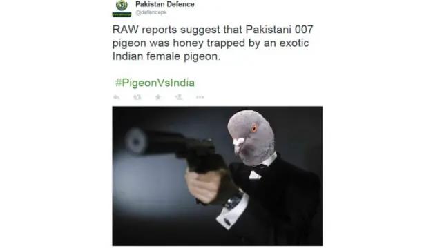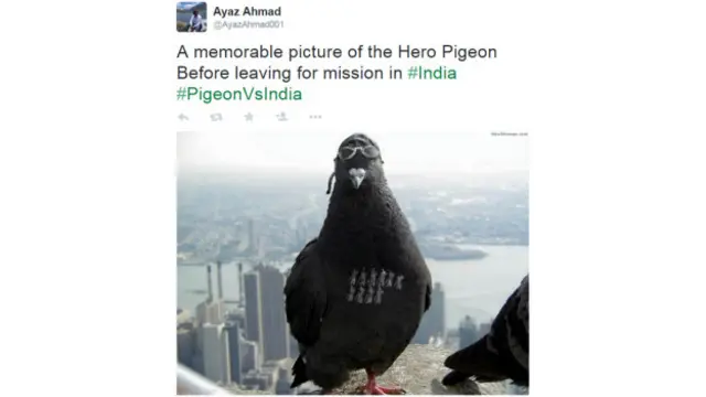 پاکستان میں بھارتی حکام کا مذاق اڑانے کے لیے کئی تصاویر بنائی گئی ہیں جن میں ایک معصوم کبوتر کو جدید دور کا جاسوس دکھایا گیا ہے۔