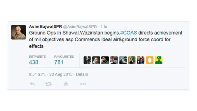 آئی ایس پی آر کے ترجمان میجر عاصم باجوہ نے جمعرات کی شب سماجی رابطوں کی ویب سائٹ ٹویٹر پر اپنے پیغام میں لکھا کہ ’ شوال میں زمینی آپریشن شروع ہو گیا ہے، آرمی چیف نے جلد ازجلد فوجی اہداف حاصل کرنے کی ہدایات جاری کی ہیں۔‘