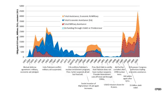 سینٹر فار گلوبل ڈیویلپمنٹ نے پاکستان کو ملنے والی امریکی امداد کے بارے میں ایک گوشوارہ بنایا ہے جس پر ایک نظر ڈالتے ہی واضح ہو جاتا ہے کہ جب جب امریکہ کی جانب سے فوجی امداد شروع ہوئی، پاکستان کے لیے امریکی سویلین امداد بھی اس عرصے میں بڑھ گئی۔