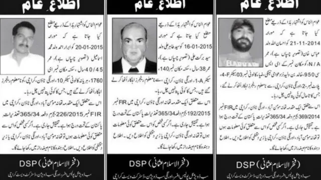منگل کو کراچی کے مقامی اخبارات میں چھ ایسے شہریوں کی گمشدگی کی اطلاع شائع ہوئی تھی جو کئی روز سے لاپتہ ہیں اور یہ اشتہارات ڈی ایس پی فخر الاسلام کے نام سے شائع ہوئے تھے۔