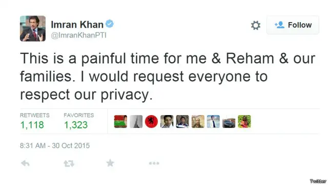 عمران خان نے ٹویٹ کی کہ ’یہ میرے، ریحام اور ہمارے خاندانوں کے لیے دکھ کا مرحلہ ہے۔ میں سب کو ہماری پرائیویسی کے احترام کی درخواست کرتا ہوں۔ میرے دل میں ریحام اور ان کے اخلاق اور کردار کی بہت زیادہ عزت ہے اور ان کے اس عزم کی کہ وہ غیر مراعات یافتہ طبقوں کی مدد کرنا چاہتی ہیں۔‘