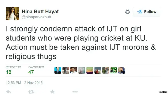 پنجاب اسمبلی کی رکن حنا بٹ نے لکھا کہ ’میں جامعہ کراچی میں اسلامی جمعیت طلبا کے ہاتھوں لڑکیوں پر حملے شدید مذمت کرتی ہوں جو کرکٹ کھیل رہی ہوں۔ ان جاہلوں اور مذہبی جنونیوں کے خلاف کارروائی ہونی چاہیے۔‘