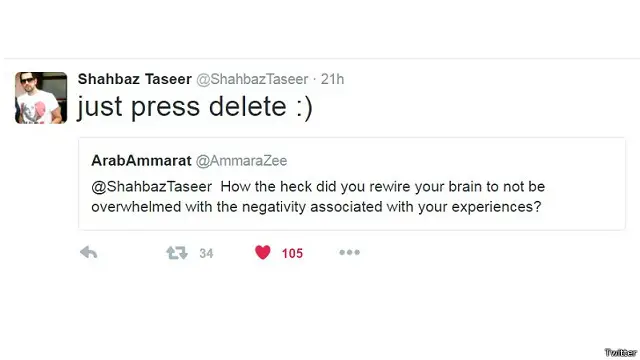 کسی نے پوچھا کہ ’آپ نے اپنے منفی تجربے اور خیالات کو کیسے اپنے اوپر حاوی نہ ہونے دیا اور مثبت سوچ کی طرف کیسے راغب ہوئے؟ شہباز نے جواب دیا ’بس ’ڈیلیٹ‘ کا بٹن دبا دیا‘ اور ساتھ میں ہنستا چہرہ لگایا۔