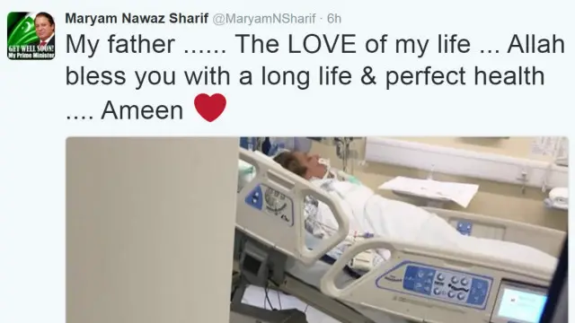 مریم نواز نے اپنی ٹویٹ میں وزیرِ اعظم کی ہسپتال کے بستر پر تصویر ٹویٹ کی اور لکھا: ’میرے والد، میری محبت، اللہ آپ کو لمبی زندگی اور بہترین صحت عطا کرے۔ آمین۔‘