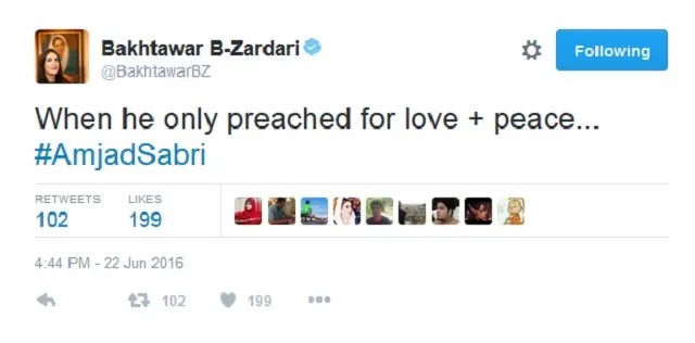 بختاور بھٹو زرادری نے ٹویٹ کی کہ ’وہ صرف محبت اور امن کا پیغام دیتے تھے۔‘