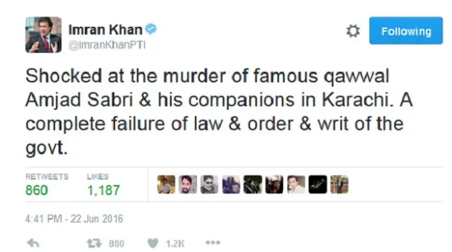پاکستان تحریکِ انصاف کے چیئرمین عمران خان نے اس پر ردِ عمل میں ٹویٹ کی کہ ’مشہور قوال امجد صابری اور ان کے ساتھیوں کے قتل پر صدمے میں ہوں۔ قانون نافذ کرنے والے اداروں اور حکومت کی عملداری کی ناکامی ہے۔‘