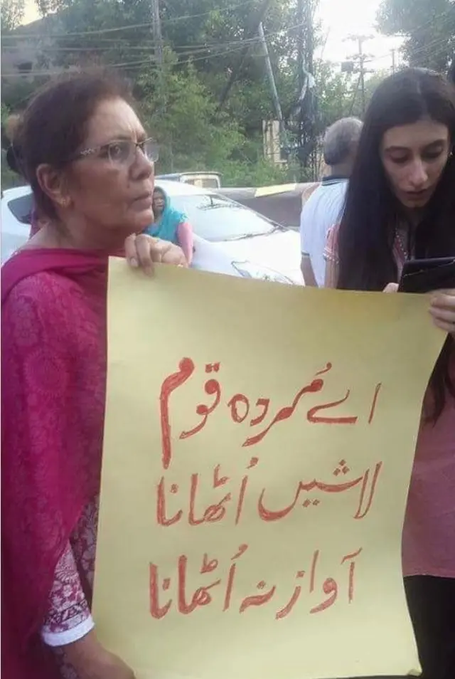 احتجاج کے لیے لکھا گیا ایک بینر جو فیس بُک پر ایک صارف نے بھجوایا۔