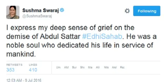 فریحہ عزیز نے لکھا ’ایدھی صاحب نے انسانیت کے بارہ میں متزلزل ہوتے ہوئے ایمان کو سہارا دیے رکھا۔ اس شہر کراچی اور اس ملک کے بارے میں جو بھی اچھا ہے اس کا مجسم نمونہ تھے وہ۔‘