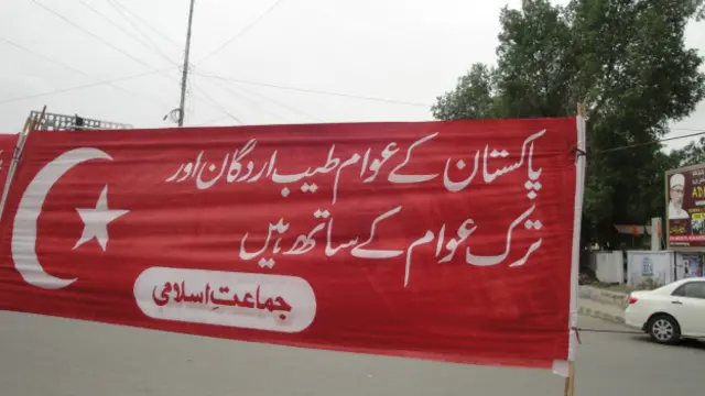 کراچی کی سڑکوں پر جماعت اسلامی کی جانب سے ترک عوام اور صدر اردوغان کے ساتھ اظہار یکہجتی کے لیے سرخ بینر لگائے گئے ہیں اور ترکی کے قومی پرچم نما بینروں پر تحریر ہے کہ ترک عوام نے اسلام دشمن لبرل امریکی لابی کو شکست دے دی ہے۔