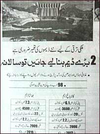 اندرون سندھ کے برعکس صوبہ سرحد میں اکثر اخبارات نے منگل کے شمارے میں وفاقی حکومت کی جانب سے نئے ڈیموں سے متعلق اشتہارات شائع کیے ہیں۔ وفاقی حکومت نے لوگوں کو ان ڈیموں کے افادیت سے آگاہ کرنے کی غرض سے ایک مہم شروع کرنے کا اعلان کیا تھا۔ اگرچہ صوبہ سرحد میں بھی کالا باغ ڈیم کے منصوبے کی سخت مخالفت پائی جاتی ہے تاہم صوبائی دارلحکومت پشاور سے شائع ہونے والے تقریبا تمام مقامی اردو اخبارات میں وفاقی حکومت کی وزارت اطلاعات اور نشریات کے یہ اشتہار چھاپے گئے ہیں۔ یاد رہے کہ سندھی اخبارات نے کالاباغ ڈیم کی میڈیا مہم کا حصہ بننے سے انکار کردیا ہے اور اس مہم کے پہلے روز ہی دس لاکھ روپے کے اشتہارات مسترد کردیےگئے تھے۔ پشاور میں شائع ہونے والے ایک صفحے کے چوتھائی سائز کے اشتہارکا عنوان ہے ’نئے ڈیموں کی تعمیر، خوشحالی کی تدبیر‘۔ ایک ڈیم کی تصویر کے ساتھ مزین ان اشتہارات میں ملکی ترقی کے لیے نئے ڈیموں کو ضروری قرار دیا گیا ہے۔ تاہم اس میں کالا باغ اور بھاشا ڈیم ڈیموں دونوں کی تعمیر کے فوائد سے متعلق اعدادوشمار دیے گئے ہیں۔