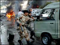 قانون نافذ کرنے والے اداروں کو ابھی تک اس حملے میں اس سے زیادہ پیش رفت نہیں ہوئی ہے سوائے اس کے کہ انہیں کلوز سرکٹ ٹی وی سے حملہ آور کے حلیے کا پتہ چلا ہے۔ وفاقی وزیر داخلہ کا کہنا ہے کہ ان کے پاس ابھی اس بارے میں اس سے زیادہ کچھ کہنے کو نہیں ہے کہ اس واقعے کی تحقیقات ہو رہی ہیں۔ گزشتہ تین سالوں میں کراچی میں امریکی قونصلیٹ پر یہ تیسرا حملہ کیا گیا ہے۔ دو حملوں میں جانی نقصان ہو ا جبکہ ایک حملے میں جانی نقصان نہیں ہوا۔ چودہ جون سن دو ہزار دو میں امریکی سیکرٹری دفاع ڈونلڈ رمزفیلڈ کے دورہ پاکستان کے ایک روز بعد امریکی قونصلیٹ کے باہر ایک کار میں بم دھماکہ ہوا تھا جس میں گیارہ افراد ہلاک اور تیس سے زیادہ زخمی ہوگئے تھے۔ اس حملے میں زخمی ہونے والوں میں قونصلیٹ کے پانچ پاکستانی ملازم اور ایک میرین گارڈ بھی شامل تھا۔اس بم دھماکے کے بعد امریکہ نے کراچی، لاہور اور اسلام آباد میں اپنے قونصلیٹ بند کردیئے تھے۔ مارچ سن دو ہزار چار میں قونصلیٹ کے باہر ایک گاڑی میں نصب بم کو ناکارہ بنایا گیا تھا۔ وین کی ایک ٹینکی میں کیمیکل سے بھرا ہوا مواد رکھا گیا تھا جس میں طاقتور ڈیٹونیٹر لگائے گئے تھے۔ کچھ مبصرین کا کہنا ہے کہ امریکی صدر جارج بش کے دورہ پاکستان سے ایک روز قبل ہونے والے اس حملے میں امریکہ اور پاکستانی حکومت کو پیغام دیا ہے کہ دہشت گردی کے خلاف عالمی جنگ ابھی ایک طویل عرصے تک جاری رہے گی۔ توقع ہے کہ امریکی صدر جارج بش اور پاکستان کے صدر جنرل پرویز مشرف کے درمیان ہونےوالی بات چیت کا محور بھی دہشت گردی کے خلاف جنگ کو مزید موثر بنانے کے لیئے ٹھوس اقدامات کرنے پر رہے گا۔ | اسی بارے میں ’ کراچی بم دھماکہ سازش ہے‘02 March, 2006 | پاکستان یہ دہشت گردی ہے: صدر بش02 March, 2006 | پاکستان دو امریکی اہلکاروں سمیت چار ہلاک02 March, 2006 | پاکستان بم دھماکہ خودکش حملہ تھا:پولیس02 March, 2006 | پاکستان امریکی قونصلیٹ پر تیسرا حملہ02 March, 2006 | پاکستان | ||||||||||||||||||||||||||||||||||||||||
