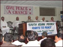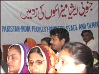 انسانی حقوق کمیشن کے ڈائریکٹرآئی اے رحمان نے کہا کہ’ بعض ایسے لوگ ہیں جوتصادم کو ہوا دے کر ووٹ لیتے ہیں اپنا اسلحہ بیچتے ہیں۔ان کے مفاد میں ہے کہ پاکستان اور بھارت میں امن نہ ہو۔‘ انہوں نے کہا کہ’ دونوں ملکوں کے عوام کو بند کمروں سے باہر نکل کر سڑکوں پر آ کرامن کے لیے جدوجہد کرنا ہوگی۔‘ دانشور اور صحافی حسین نقی نے کہا کہ پاکستان میں کچھ انتہا پسند لوگوں کو ریاست سے ماورا طاقت حاصل ہوچکی ہے اور وہ نہیں چاہتے کہ امن کوششیں کامیابی سے ہمکنار ہوں۔ سیمینار سے تہمینہ زمان، عزیز مظہر سمیت دیگر مقررین نے بھی خطاب کیا۔ مقررین نے ممبئی بم دھماکوں کی مذمت کرتے ہوئے دونوں ملکوں میں امن عمل جاری رکھنے کے ضرورت پر زور دیا۔ ہال میں مختلف پوسٹر اور بینر لگے تھے جن پر درج تھا ’امن کی راہیں کھول دو‘،’جنوبی ایشیا میزائلوں کی زد میں‘،’امن کے لیے جدوجہد ہر حالت میں لازم ہے‘،’دونوں بنیں گے امن کا نشان پاکستان۔۔۔۔ہندوستان‘ | اسی بارے میں دلی میں پاک انڈیا پیپلز فورم26 February, 2005 | پاکستان عالمی ادارے جائزہ لیں: عاصمہ10 January, 2006 | پاکستان ہوائی حملے ہوئے ضرور ہیں:عاصمہ28 December, 2005 | پاکستان ’ایسے انتخابات بے معنی ہیں‘27 August, 2005 | پاکستان | ||||||||||||||||||||||||||||||||||||||||