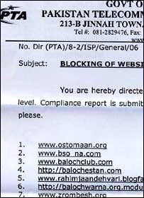 پاکستان ٹیلی کمیونیکیشن اتھارٹی(پی ٹی اے) کی جانب سےجاری کردہ ایک حالیہ ہدایت نامے کے مطابق ملک کی تمام انٹرنیٹ سروس فراہم کرنے والی کمپنیوں کو کچھ مخصوص بلوچ ویب سائٹس تک رسائی روکنے کی ہدایت دی گئی ہے۔ چھبیس جولائی کو پی ٹی اے کی جانب سے جاری کردہ اس ہدایت نامے میں چونتیس ویب سائٹس کی فہرست شائع کی گئی ہے۔ اس فہرست میں بیشتر ایسی ویب سائٹس شامل ہیں جن پر علاقائی زبان میں بلوچ قوم پرست تحریک سے وابسطہ مواد اور حکومت کی جانب سے بلوچستان میں فوجی آپریشن کے حوالے سے خبریں شائع کی گئی ہیں۔ اس فہرست میں ’ریڈیو بلوچ ڈاٹ آرگ‘ شامل ہے۔ یہ ویب سائٹ بلوچستان سے منسلک واقعات پر تحریری اور صوتی مواد شائع کرتی ہے۔ اس کے علاوہ فہرست میں ’بروہی ڈاٹ ٹی کے‘، ’گولبیگ ڈاٹ این یو‘ اور ’بلوچ یونین ڈاٹ کام‘ جیسی ویب سائٹس بھی شامل ہیں جو زیر تعمیر ویب سائٹس یا ’پارکڈ ڈومین‘ ظاہر ہوتی ہیں۔ اس فہرست میں ’بلوچ ڈاٹ بلاگ سپاٹ ڈاٹ کام‘ ، ’پیام بلوچ ڈاٹ پرشین بلاگ ڈاٹ کام‘ اور’ ڈوشہ ڈاٹ پرشین بلاگ ڈاٹ کام‘ جیسی مقامی زبان کے بلاگ بھی شامل ہیں۔