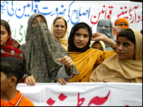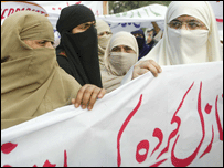 جمعہ کی سہ پہر لاہور میں جماعت اسلامی سے تعلق رکھنے والی خواتین کارکنوں نے اسلامی سزاؤں کے متنازعہ قانون حدود آرڈیننس میں ترمیم کیے جانے خلاف مظاہرہ کیا اور اسے برقرار رکھنے کا مطالبہ کیا۔ جنرل پرویز مشرف کی حکومت نے عورتوں سے زیادتی سے متعلق متنازعہ حدود آرٹیننس میں ترامیم کرنے کے لیے چودہ اگست کو پارلیمینٹ میں نیا مسودہ قانون پیش کرنے کا عندیہ دیا ہے تاہم اسلامی جماعتیں حدود آرڈیننس میں کسی ترمیم کے سختی سے خلاف ہیں۔ جمعہ کی سہ پہر لاہور میں جماعت اسلامی کی درجنوں کارکن خواتین نے پریس کلب کے باہر حدود آرڈیننس میں کسی ترمیم کے خلاف مظاہرہ کیا۔ خواتین نے بینرز اٹھا رکھے تھے جن پر لکھا ہوا تھا کہ ’حدود آرڈیننس کو چھیڑنا خدا کے عذاب کو دعوت دینے کے مترادف ہے’۔ جماعت اسلامی کی خواتین کمیشن کی صدر آسیہ سرور نے اس مظاہرہ کی قیادت کی۔ انہوں نے اپنے موقف کی وضاحت کرتے ہوئے کہا کہ عورتوں کے مسائل حدود قوانین کو تبدیل کرنے سے نہیں بلکہ عدالتوں اور پولیس کے نظام میں اصلاح سے حل ہوں گے۔