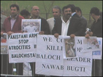 بلوچ قوم پرستوں نے نواب اکبر بگٹی کی ہلاکت کے خلاف احتجاج کیا اور بلوچستان میں فوجی آپریشن بند کرنے کا مطالبہ کیا ہے۔ مظاہرین سے خطاب کرتے ہوئے مقررین نے کہا کہ پاکستان دہشت گردی کا گڑھ بن چکا ہے۔ ’پاکستان اور صدر مشرف القاعدہ اور طالبان جنگجوؤں کی سرپرستی کر رہے ہیں۔‘ مقررین نے بین الاقوامی برادری سے بھی اپیل کی کہ وہ اپنا اثرو رسوخ استعمال کر کے قوم پرستوں کے خلاف ظلم کو بند کروائیں۔ | اسی بارے میں ’وزیرستان معاہدہ ملا عمر نے کرایا‘ 25 September, 2006 | پاکستان بینظیر، نواز کے لیئے مزید انتظار 26 September, 2006 | آس پاس باہمی اختلافات دور کریں: بش28 September, 2006 | آس پاس ’ کتاب سکیورٹی رسک ہے‘27 September, 2006 | پاکستان | ||||||||||||||||||||||||||||||||||||||||