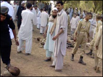 صوبہ سرحد کے علاقے درگئی کے قریب پنجاب ریجمنٹ کے تربیتی مرکز پر خود کش حملے کے بعد فوج اور سکیورٹی اہل کار خود کش حملہ آور کے ساتھی کی تلاش کر رہے ہیں۔ عینی شاہدوں کے مطابق حملے کے بعد فوج اور سکیورٹی اہل کاروں کی ایک بڑی تعداد نے وقوعہ سے دو کلو میٹر دور موسی بابا کے گاؤں کے قریب گنے کے کھیتوں کو گھیرے میں لے لیا۔ اطلاعات کے مطابق فوج اور سکیورٹی اہلکاروں کو شبہہ تھا کہ ان کھیتوں میں خود کش حملہ آوور کا ایک ساتھی روپوش ہے۔ ذرائع کے مطابق خود کش حملہ آوور کے ساتھی کی تلاش کے لیئے فوج نے تربیت یافتہ کتوں کی مدد بھی طلب کر لی ہے جہنیں ہیلی کاپٹروں کے ذریعے وہاں پہنچایا جا رہا ہے۔ گاؤں والوں کے مطابق انہوں نے کھیتوں کی طرف گولیوں کے چلنے کی آوازیں بھی سنیں ہیں۔ درگئی میں پنجاب ریجمنٹ کے تربیتی مرکز پر خود کش حملے کی اطلاع ملتے ہی پشاور سے بڑی تعداد میں ملکی اور غیر ملکی ذرائع ابلاغ کے نمائندے وہاں پہنچا شروع ہو گئے۔ تربیتی مرکز کے قریب جس میدان میں یہ خود کش حملہ ہوا تھا اسے بڑی تعداد میں فوج اور لیویز کے اہلکاروں نے گھیرے میں لے رکھا تھا اور کسی شخص کو میدان میں داخل ہونے کی اجازت نہیں دی جا رہی تھی۔ موقع پر موجود اخبار نویسوں نے تربیتی مرکز سے چودہ ایمبولینسوں کو نکلتے ہوئے دیکھا جن میں اطلاعات کے مطابق دھماکے میں ہلاک ہونے والے فوجیوں کی لاشوں کو پشاور منتقل کیا جا رہا تھا۔ | اسی بارے میں پاک فوج کے تربیتی مرکز پر ’خودکش‘ حملہ: 42 فوجی ہلاک 08 November, 2006 | پاکستان فوج پر حملے، کب اور کیسے08 November, 2006 | پاکستان گورنر سرحد پر راکٹ حملہ07 November, 2006 | پاکستان باجوڑکے زخمی نامعلوم جگہ منتقل06 November, 2006 | پاکستان | ||||||||||||||||||||||||||||||||||||||||