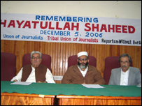 پاکستان میں صحافیوں کی مرکزی تنظیم نے اپنی ایک رپورٹ میں انکشاف کیا ہے کہ قبائلی صحافی حیات اللہ خان کو خفیہ اداروں نے قتل کیا تھا۔ صحافیوں کی مرکزی تنظیم پاکستان فیڈرل یونین آف جرنلسٹس (پی ایف یو جے) کے سیکرٹری جنرل مظہر عباس کی جانب سے ریلیز کی گئی یہ رپورٹ منگل کے روز پشاور پریس کلب میں مرحوم صحافی حیات اللہ کی یاد میں منعقدہ تقریب میں جاری کی گئی۔ تقریب میں مختلف سیاسی جماعتوں کے رہنماؤں کے علاوہ پشاور اور قبائلی علاقوں سے تعلق رکھنے والے اخبار نویسوں نے بڑی تعداد میں شرکت کی۔ تقریب کا اہتمام خیبر یونین آف جرنلسٹس ، ٹرائیبل یونین آف جرنلسٹس اور صحافیوں کی حقوق کےلئے سرگرم عمل بین الاقوامی فرانسیسی تنظیم رپورٹرز ودآؤٹ بارڈرز نے کیا تھا۔ کے ایچ یو جے کے صدر انتخاب امیر کی مرتب کردہ اس رپورٹ میں دعوٰی کیا گیا ہے کہ مرحوم صحافی حیات اللہ کو پاکستان کے خفیہ اداروں نے اغواء کرکے قتل کیا تھا۔ رپورٹ میں اس بات پر افسوس کا اظہار کیا گیا ہے کہ حکومت نے قبائلی صحافی کے قتل کے حوالے سے اب تک تین انکوائریاں مکمل کی ہیں لیکن تاحال کوئی بھی رپورٹ منظر عام پر نہیں لائی گئی ہے۔ رپورٹ کے مطابق اس سے صاف ظاہر ہوتا ہے کہ حکومت حقائق کو چھپانا چاہتی ہے۔ اس سے قبل تقریب سے خطاب کرتے ہوئے پاکستان پیپلز پارٹی پارلمینٹرینز کے صوبائی صدر رحیم داد خان ، جماعت اسلامی کے صوبائی امیر سراج الحق، عوامی نیشنل پارٹی کے مرکزی رہنما افراسیاب خٹک ، ٹرائیبل یونین آف جرنلسٹس کے صدر سیلاب محسود ، حضرت خان مہمند اور انصر عباس نے مرحوم صحافی کوشاندار الفاظ میں خراج تحسین پیش کیا اور حکومت سے مطالبہ کیا کہ ان کے قاتلوں کو فوری طور پر بے نقاب کیا جائے ۔ مقررین نے حالیہ دنوں میں صحافیوں کے خلاف پرتشدد کاروائیوں کی بھی سخت الفاظ میں مذمت کی اور مطالبہ کیا کہ اخبار نویسوں کو پیشہ ورانہ ذمہ داریوں کے دوران تحفظ فراہم کیا جائے۔ اس موقع پر پاکستان میں رپورٹرز ودآؤٹ بارڈرز کے نمائندے اقبال خٹک نے تنظیم کی طرف سے جاری کردہ ایک بیان تقریب میں پڑھ کر سنایا جس میں پاکستان میں صحافیوں کے خلاف بڑھتے ہوئے تشدد کی کارروائیوں پر سخت تشویش کا اظہار کیا گیا ہے۔ واضح رہے کہ قبائلی صحافی حیات اللہ خان کو ایک سال قبل پانچ دسمبر کو شمالی وزیرستان میں اغواء کیا گیا تھا۔ وہ چھ ماہ تک لاپتہ رہے اور بعد میں ان کی گولیوں سے چھلنی لاش ملی تھی۔ | اسی بارے میں حیات اللہ کے لیئےصحافتی ایوارڈ14 October, 2006 | پاکستان صحافی حیات اللہ قتل انکوائری17 September, 2006 | پاکستان حیات اللہ کا قتل‘ طالبان کا انکار20 June, 2006 | پاکستان ’حکومت پرائم اکیوزڈ ہے‘ گورنر19 June, 2006 | پاکستان ’حیات اللہ کو جال میں پھنسایا گیا‘18 June, 2006 | پاکستان صحافی حیات اللہ کا قتل 16 June, 2006 | پاکستان | ||||||||||||||||||||||||||||||||||||||||