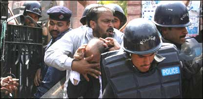 لاہور میں چیف جسٹس افتخار محمد چودھری کے حق میں وکلاء کے احتجاج کے موقع پر پولیس کے پتھراؤ، لاٹھی چارج اور آنسو گیس پھینکنے سے متعدد افراد زخمی ہوگئے ہیں۔ ہمارے نامہ نگار عدنان عادل کے مطابق سنیچر کو لاہور ہائی کورٹ بار اور دیگر وکلاء تنظیموں کے زیر اہتمام وکلاء کا ایک کنونشن ہورہا تھا کہ کچھ وکلاء نے ہائی کورٹ سے باہر جلوس کی صورت میں نکلنے کی کوشش کی تو پولیس نے ان پر دھاوا بول دیا۔ لاہور ہائی کورٹ کے باہر صبح سے زرہ پہنے اور لاٹھیوں سے مسلح پولیس کی بڑی نفری موجود تھی۔ آئی جی پنجاب احمد نسیم اور لاہور پولیس کے چیف ملک اقبال نے خود اس جگہ کا معائنہ کیا۔ باہر سڑک پر پولیس کی بکتر بند گاڑیاں کھڑی کی گئی تھیں۔ پولیس نے وکلاء کی ایک ٹولی کو مال روڈ پر جانےسے روکنے کے لیے عدالت عالیہ کے احاطے کے اندر دھکیلا اور گیٹ بند کرنے کی کوشش کی جس پر وکیلوں اور پولیس میں تصادم شروع ہوگیا جو دو گھنٹے تک جاری رہا۔