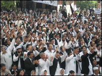 تقریب سے افتخار چودھری کے وکلاء منیر اے ملک، چودھری اعتزاز احسن، علی احمد کرد، قاضی انورایڈوکیٹ، حامد خان اور پشاور ہائی کورٹ بار کونسل کے صدر عبدالطیف آفریدی نے بھی خطاب کیا۔ منیر اے ملک نے اپنی تقریر میں اعلان کیا کے صدارتی ریفرنس سے متعلق حکومت کے ساتھ کسی قسم کے کوئی مذاکرات نہیں ہوں گے اور ان کی یہ تحریک اس وقت تک جاری رہے گی جب تک عدلیہ کو مکمل آزادی نہیں ملتی اور لاپتہ افراد کو رہا نہیں کر دیا جاتا۔ چودھری اعتزاز احسن نے کہا کہ پاکستان میں صرف ایک ہی شخص کی حمکرانی ہے اور تمام فیصلے پارلیمنٹ سے باہر ہوتے ہیں۔ انہوں نے کہا کہ ملک کا وزیراعظم بےاختیار ہے۔ انہوں نے اس سلسلے میں ایک مثال دیتے ہوئے کہا کہ جب مختار مائی کا نام ایگزٹ کنٹرول لسٹ میں شامل کیاگیا تو خود شوکت عزیز نے پارلیمنٹ میں ان سے سرگوشی کے انداز پوچھا کہ مختار مائی کا نام کس نے ایگزٹ کنٹرول لسٹ میں شامل کیا ہے۔ اعتزاز احسن کے بقول انہوں نے وزیراعظم سے کہا کہ وہ یہ سوال وزیر داخلہ سے پوچھے لیکن انہوں نے جواب میں کہا کہ انہیں بھی کچھ معلوم نہیں ہے۔ اس سے قبل ’معطل‘ چیف جسٹس افتخار چودھری کا اسلام آباد سے پشاور آتے ہوئے راستے میں مختلف جگہوں پر زبردست استقبال ہوا اور انہوں نے تین گھنٹے کی مسافت تقریباً نو گھنٹے میں طے کر لی۔ صوبہ سرحد اور اور صوبہ پنجاب کو تقسیم کرنے والے خیر آباد پل پر صوبہ بھر کے ہزاروں وکلاء اور سیاسی پارٹیوں کے کارکنوں نے ان کا پر جوش استقبال کیا۔ استقبال کرنے والوں میں عوامی نیشنل پارٹی کے کارکن زیادہ نمایاں نظر آئے جبکہ پیپلز پارٹی، مسلم لیگ (ن) اور تحریک انصاف کے کارکن بھی خاصے پرجو ش تھے۔ متحدہ مجلس عمل جو اسلام آباد میں سماعت کے موقع پر احتجاج میں پیش پیش رہا ہے لیکن صوبہ سرحد میں حکومتی پارٹی ہونے کے باوجود افتخار چودھری کے استقبال کے لیے زیادہ کارکن جمع نہ کرسکا البتہ جماعت اسلامی نے نوشہرہ کے مقام پر ایک استقبالی کیمپ لگایا تھا۔ ’معطل‘ چیف جسٹس کے خیر آباد پل پر پہنچنے سے قبل وکلاء پرجو ش انداز میں تقریباً تین گنٹھے تک ’گو مشرف گو‘ ، ’چودھری ہیرو مشرف زیرو‘،’ کالا کوٹ کالی ٹائی مشرف کی شامت آئی‘ اور ’عدلیہ بچاؤ مشرف بھگاؤ‘ کے نعرے لگاتے رہے۔ وکلاء خیر آباد پل پرمسلم لیگ (ق) کی طرف سے لگائی گئی جنرل پرویز مشرف کی تصویر کو اتار کر اسے کافی دیر تک پاؤں تلے روندتے اورجوتے مارتے رہے۔ بعد میں انہوں نے جلوس کی صورت میں جاکر تصویر دریائےسندھ میں پھینک دی۔ اٹک سے پشاور تک جی ٹی روڈ پر لوگ جگہ جگہ افتخار چودھری کے استقبال کے لیےکھڑے تھے اور سیاسی پارٹیوں نے بعض مقامات پراستقبالی کیمپ قائم کیے تھے۔ کئی مقامات پر بڑے بڑے بینرز آویزاں کیے گئے تھے جن پر جسٹس افتخار چودھری کی حمایت میں نعرے درج تھے۔ اس موقع پر سیکیورٹی کے سخت انتظامات تھے اور پشاور ہائی کورٹ کے باہر پولیس کی بھاری نفری تعینات تھی۔ہائی کورٹ کے داخلی دروازے پر اندر جانے والوں کی تلاشی لی جارہی تھی۔ ’معطل‘ چیف جسٹس کے وکلاء نے صوبہ سرحد میں ان کے استقبال کو تاریخی قرار دیا اور کہا کہ یہ راولپنڈی، سکھر اور حیدرآباد میں ہونے والے استقبال سے کافی بڑا ہے۔ |