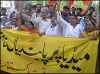 نصراللہ ملک کا کہنا تھا کہ نامہ نگار جب کیبل آپریٹرز سے چینل بند رکھنے کی وجہ پوچھتے ہیں تو کہا جاتا ہے کہ انہوں نے ایسا انتظامیہ کے حکم پر کیا ہے۔ لیکن انتظامی افسروں سے رابطہ کرتے ہیں تو وہ کہتے ہیں کہ انہوں نے ایسی کوئی ہدایت جاری نہیں کی ہے۔ آج ٹی وی لاہور کے بیورو چیف نعمان یاور کے مطابق شمالی پنجاب کے اکثر علاقوں میں نشریات جزوی طر پر بند کر دی گئی ہیں۔ ان کا کہنا تھا کہ راولپنڈی، چکوال اور سرگودھا سے ایسی شکایات موصول ہوئی ہیں، تاہم لاہور یا سنٹرل پنجاب کے باقی علاقوں میں نشریات ابھی تک دیکھی جا رہی ہیں۔ دوسری طرف ٹی وی چینلز کی براہ راست نشریات پر پابندی کے خلاف لاہور میں احتجاجی مظاہرہ کیا گیا ہے۔ لیبر پارٹی پاکستان کی جانب سے جمعہ کے روز پریس کلب کے سامنے درجنوں لوگوں نے احتجاج کیا۔ احتجاجی مظاہرے میں شریک مرد و خواتین نعرے بازی کر رہے تھے بوٹوں والو صحافت پر حملے بند کرو، صحافیوں پر تشدد بند کرو، لاٹھی گولی کی سرکار نہیں چلے گی اور لٹ کے کھا گیا جی ایچ کیو۔ مظاہرے سے خطاب کرتے ہوئے سندھی قوم پرست رہنماء رسول بخش پلیجو نے موجودہ بحران میں ذرائع ابلاغ کے کردار کو سراہتے ہوئے کہا کہ پوری قوم میڈیا کے ساتھ ہے۔ ’میڈیا پر قدغن حکمرانوں کو عوام کے سامنے بے نقاب کرنے کی وجہ سے لگائی جا رہی ہے‘۔ |