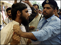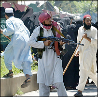 عینی شاہدین کے مطابق لال مسجد سے تعلق رکھنے والے طلبہ نے کورڈ مارکیٹ کے قریب واقع ایک سرکاری سکول پر قبضہ کر لیا اور وہاں توڑ پھوڑ کی۔ مشتعل طلبہ نے جامعہ حفصہ کے سامنے واقع سٹیٹ آفس اور اس سے متصل وزارتِ ماحولیات کی عمارت اور اس کے احاطے میں کھڑی گاڑیوں کو بھی آگ لگا دی۔ اس سے پہلے بھی لال مسجد انتظامیہ حکومتی کارروائی کی صورت میں خودکش حملوں کی دھمکی دیتی رہی ہے۔ اسلام آباد کی لال مسجد سےملحقہ مدرسے حفصہ کی طالبات کی طرف سے اس سال جنوری میں قریبی لائبریری پر قبضے کے بعد سے دارالحکومت کی یہ قدیم ترین مسجد ذرائع ابلاغ کی توجہ کا مرکز رہی ہے۔اس واقعے کے بعد مسجد کے طلباء نے ایک گھر پر چھاپہ مار کر تین خواتین کو اغواء کر لیا تھا۔ گزشتہ مہینے طلباء نے ایک مساج پارلر سے چھ غیر ملکیوں سمیت نو افراد کو اغواء کر لیا تھا جنہیں بعد میں رہا کر دیا گیا۔ | اسی بارے میں لال مسجد کے حق میں مظاہرے03 July, 2007 | پاکستان خودکش حملوں کی دھمکی06 April, 2007 | پاکستان لال مسجد: خطبہ جمعہ کا متن06 April, 2007 | پاکستان لال مسجد گولڈن ٹمپل کی راہ پر06 April, 2007 | پاکستان لال مسجد کی ویب سائٹ پر پابندی07 April, 2007 | پاکستان لال مسجد انتظامیہ سے مذاکرات08 April, 2007 | پاکستان جامعہ حفصہ مدارس بورڈ سے خارج09 April, 2007 | پاکستان عدالتی بحران کمبل، لال مسجد خفیہ ہاتھ27 May, 2007 | پاکستان | ||||||||||||||||||||||||||||||||||||||||