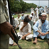 ڈپٹی کمشنر نے بتایا کہ گرفتار شدہ بارہ سو افراد میں سے ایک سو پچاس کو اڈیالہ جیل بھجوا دیا گیا ہے، دو سو کو اپنے گھروں کو جانے کی اجازت دے دی گئی جبکہ باقی افراد سے ابھی پوچھ گچھ جاری ہے۔ بدھ کو مذہبی امور کے وفاقی وزیر اعجازالحق نے ایک نجی ٹی وی کو انٹرویو دیتے ہوئے کہا کہ انہوں نے زیرحراست مولانا عبدالعزیز سے ملاقات کی ہے اور انہیں کہا ہے کہ وہ اپنے بھائی کو بھی خود کو حکام کے حوالے کرنے کے لیے کہیں۔ وفاقی وزیر کے مطابق مولانا عبدالعزیز نے انہیں یقین دہانی کرائی ہے کہ وہ اپنے بھائی کو یہ مشورہ دیں گے۔ اعجاز الحق کے مطابق مولانا عبدالعزیز کی عبدالرشید سے بات کرانے کی کوشش کی جا رہی ہے۔ واضح رہے کہ گذشتہ چھ ما کے عرصے میں مولانا عبدالعزیز کے خلاف دہشت گردی کے سات مقدمات درج ہیں اور انہیں عدالت نے اشتہاری قرار دیا ہوا ہے۔ اس سے قبل بدھ کی شام لال مسجد کے باہر ایک مرتبہ پھر فائرنگ کا سلسلہ شروع ہوا تاہم مسجد کے قرب و جوار کے علاقے میں تاحال کرفیو نافذ رہا۔ مسجد میں مورچے خالی پڑے ہوئے تھے اور اکا دُکا طلبا اور طالبات لال مسجد چھوڑ کر باہر آ رہے تھے۔ مسجد کے سامنے سرکاری کواٹرز تقریباً خالی ہوگئے۔ مسجد کے سامنے کواٹرز میں رہنے والے ایک رہائشی یاسین نے ہمارے نامہ نگار کو بتایا کہ صبح سے فائر بندی تھی اور مذاکرات جاری تھے لیکن بعد میں ایک ایک کرکے طلبہ و طالبات مسجد اور مدرسے سے نکلنا شروع ہوگئے۔ اس سے قبل ڈپٹی کمشنر اسلام آباد چوہدری محمد علی نے بی بی سی بات کرتے ہوئے کہا کہ بدھ سہ پہر تک سات سو طلبہ اور طالبات جامعہ حفصہ اور لال مسجد سے باہر آئے۔ چوہدری محمد علی کا کہنا تھا کہ ان سات سو میں سے دو سو بیس طالبات جبکہ باقی طالبعلم ہیں۔ باہر آنے والے طلبا سے حکام نے کاغذوں پر انگوٹھے لگوائے گئے اور یہ اعلانات کیے جاتے رہے کہ باہر آنے والوں کے خلاف کوئی کارروائی نہیں کی جائے گی۔تاہم بعد دوپہر حکام نے والدین کی رجسٹریشن اور انہیں اندر بھجوانے کا سلسلہ بند کردیا اور انہیں کہا کہ وہ وہاں سے چلے جائیں۔ (بی بی سی کے نامہ نگار ہارون رشید، مظہر زیدی اور احمد رضا کی رپورٹوں پر مبنی) |