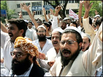 دارالحکومت اسلام آباد میں نمازِ جمعہ کے بعد مظاہرین سڑکوں پر نکل آئے اور حکومت کے اس اقدام کے خلاف شدید نعرے بازی کی۔اسلام آباد میں متحدہ مجلس عمل کی کال پر سینکڑوں احتجاجی مظاہرین نے جلوس نکالا۔ جلوس کے شرکاء نے بینر اور کتبے اٹھا رکھے تھے جن پر حکومت مخالف نعرے درج تھے۔ احتجاجی جلوس سے خطاب کرتے ہوئے مقررین نے جہاں ایک طرف لال مسجد کی انتظامیہ کے رویے سے لاتعلقی کا اعلان کیا وہیں حکومت کی جانب سے کیے جانے والے آپریشن کی شدید مذمت کی۔ پشاور سے بی بی سی کے نامہ نگار عبدالحئی کاکڑ کے مطابق صوبہ سرحد میں سب سے بڑا مظاہرہ ایم ایم اے کے زیر اہتمام ضلع بٹگرام میں کیا گیا ہے جس میں ایک اندازے کے مطابق پندرہ سو سے زیادہ افراد نے شرکت کی۔مظاہرے سے خطاب کرتے ہوئے مقررین نے الزام لگایا کہ جنرل مشرف امریکہ کے ایجنڈے پرعمل پیرا ہیں اور بقول انکے جنرل مشرف اور صدر بش کے سوچ وفکر میں کوئی تضاد نہیں ہے۔ پشاور میں بھی ایم ایم اے کے زیر اہتمام ہونے والے مظاہرے میں صوبائی وزیر امان اللہ حقانی اور ایم این اے صابر اعوان اور دیگر مقررین نے سپریم کورٹ سےمطالبہ کیا ہے کہ وہ لال مسجد کیخلاف فوجی آپریشن کا از خود نوٹس لیتے ہوئے ایک عدالتی کمیشن تشکیل دیں تاکہ حقائق عوام کے سامنے لائے جاسکیں۔انہوں دھمکی دی کہ اگر جنرل پرویز مشرف نے مساجد اور مدارس کیخلاف مہم جاری رکھی گئی تو اسلام آباد تک احتجاجی مارچ کیا جائے گا۔اسکے علاوہ صوبہ سرحد کے دیگر علاقوں نوشہرہ، مردان،چترال، ڈی آئی خان ،مانسہرہ ، ہنگو اور کالاڈھاکہ میں بھی مظاہرے کیے گئے ہیں۔ |