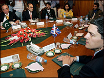 خورشید محمود قصوری کا کہنا تھا: ’ایسے بیانات غیرذمہ دارانہ ہیں، نہیں دیے جانے چاہیں۔ دراصل اس قسم کے بیانات پاکستان اور امریکہ کے درمیان تعاون اور کوششوں کو نقصان پہنچا سکتے ہیں۔ پاکستان جو کچھ بھی کر رہا ہے اپنے مفاد میں کر رہا ہے۔ دہشت گردی پاکستان کے مفاد میں نہیں۔ بعض امریکی ترجمان یا وہ جو کوئی بھی تھے جذبات کی رو میں بہہ گئے تھے‘۔ گزشتہ دنوں بعض اعلیٰ امریکی اہلکاروں نے کہا تھا کہ پاکستان میں دہشت گردی کے مشتبہ ٹھکانوں پر امریکی حملوں کا امکان موجود ہے۔ پاکستان کے وزیرِ خارجہ نے اس موقع پر عالمی برادری سے افغان سرحد سیل کرنے پر تعاون نہ کرنے کی بھی شکایت کی۔ ان کا کہنا تھا کہ ان کی باڑ لگانے یا بارودی سرنگیں بچھانے کی تجاویز نہ صرف بین الاقوامی برادری نے مسترد کیں بلکہ اس کا کوئی متبادل حل بھی نہیں بتایا۔’چمن کے مقام پر سرحد کو روزانہ تیس ہزار لوگ پار کرتے ہیں۔ انہیں روکنا ممکن نہیں یہ لوگ کاروباری ہیں دہشت گرد نہیں‘۔ برطانوی وزیر خارجہ نے بتایا کہ انہوں نے برطانیہ میں دہشت گردی کے واقعات کی کڑیاں پاکستان سے ملنے کے معاملے پر بھی بات کی۔ انہوں نے بتایا کہ اس بابت دونوں ممالک کی ذمہ داریاں بنتی ہیں۔ ’ہمیں اس سپلائی روٹ کو کاٹنا ہوگا‘۔ برطانوی وزیر خارجہ نے جمعرات کی صبح صدر جنرل پرویز مشرف سے بھی ملاقات کی جس میں دہشت گردی کے خلاف جنگ کے علاوہ اقتصادی تعاون پر بھی بات ہوئی۔ متحدہ قومی موومنٹ کے سربراہ الطاف حسین کے خلاف عمران خان کے مقدمے کے بارے میں برطانوی وزیر خارجہ نے کچھ کہنے سے انکار کیا۔ ان کا موقف تھا کہ یہ معاملہ زیرِ تفتیش ہے لہذا ان کے لیے اس بارے میں کچھ کہنا درست نہیں ہوگا۔ | اسی بارے میں ملی بینڈ کا پہلا دورۂ پاکستان26 July, 2007 | پاکستان ’امریکہ اور برطانیہ دباؤ ڈالیں‘06 June, 2007 | پاکستان برطانیہ میں ناکام حملوں کی مذمت02 July, 2007 | پاکستان برطانوی سفارتکار کا مدرسے کا دورہ09 August, 2005 | پاکستان کچھ مدرسوں سے پریشانی ہے: برطانیہ15 July, 2005 | پاکستان برطانیہ جواب دے: جنرل مشرف 10 December, 2003 | پاکستان ’برطانیہ سے وضاحت مانگی ہے‘07 November, 2003 | پاکستان | ||||||||||||||||||||||||||||||||||||||||