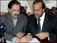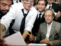 وزیر اعظم شوکت عزیز نے صدر جنرل پرویز مشرف کو دوبارہ صدر منتخب کراونے کے لئے ان کے کاغذات نامزدگی جمعرات کی صبح الیکشن کمیشن میں جمع کر دیے۔ ان کے علاوہ جن امیدواروں کے کاغذات اسلام آباد میں جمع کرائے گئے ہیں ان میں وکلاء کے امیدوار جسٹس وجیہہ الدین احمد اور پیپلز پارٹی کے مخدوم امین فہیم شامل ہیں۔ طے شدہ پروگرام کے مطابق صدر جنرل پرویز مشرف کے کاغذات نامزدگی جمع کرانے کے لئے وزیر اعظم شوکت عزیز، حکمراں مسلم لیگ کے صدر چودھری شجاعت حسین، تین صوبوں کے وزرائے اعلیٰ اور وفاقی وزراء سمیت الیکشن کمیشن پہنچے۔ صوبہ سرحد کے وزیر اعلیٰ اکرم خان درانی وہاں موجود نہیں تھے۔ الیکشن کمیشن کے ذرائع کے مطابق صدر کی جانب سے ان کے سترہ کاغذات نامزدگی جمع کرائے گئے ہیں جن میں سے ایک میں وزیر اعظم شوکت عزیز ان کے تجویز کنندہ جبکہ وفاقی وزیر ثقافت غازی گلاب جمال تائید کنندہ ہیں۔ چیف الیکشن کمشنر جسٹس (ریٹائرڈ) محمد فاروق نے اپنے دفتر میں صدر مشرف کے کاغذات وصول کیے۔اس موقع پر صحافیوں سے بات کرتے ہوئے وزیر اعظم نے اس امید کا اظہار کیا کہ جنرل مشرف کامیاب ہو جائیں گے جس سے ملک میں جمہوریت مستحکم ہوگی۔