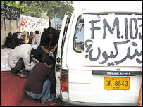 پاکستان میں ذرائع ابلاغ پر سرکاری پابندیوں کے باعث ریڈیو چینل ایف ایم 103 کی نشریات کو بطور احتجاج سڑکوں پر لایاگیا ہے۔ کراچی کی سڑکوں پر آج کل چلتا پھرتا ایک ریڈیو اسٹیشں نظر آسکتا ہے۔ سفید رنگ کی گاڑی میں بنے اس ریڈیو اسٹیشن سے منگل کو علامتی نشریات کراچی پریس کلب کے باہر سے جاری تھیں۔ اس گاڑی پر احتجاجی پوسٹر آیزاں تھے۔ ایف ایم 103 ریڈیو چینل کے عملے نے حکومتی اقدامات کے خلاف احتجاج کرنے کا یہ انوکھا طریقہ اپنایا ہے جس کے تحت وہ نشریاتی آلات نصب شدہ گاڑی کو کراچی پریس کلب کے سامنے لاتے ہیں، جہاں فنکار اپنے فن کا مُظاہرہ کرتے ہیں، موسیقاروں کی دھن پر گلوکار گانے گاتے ہیں۔ ریڈیو اسٹیشن کا عملہ بطور احتجاج ’دیے‘ روشن کرتے ہیں اور اسٹیشن منیجر دیگر آرٹسٹوں کے ہمراہ دیواروں اور پوسٹروں پر تحریروں اور کارٹونوں کے ذریعے اپنا احتجاج ریکارڈ کراتے ہیں۔