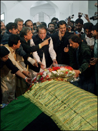 سابق وزیرِاعظم میاں نواز شریف کے لاہور سے نوڈیرو پہنچنے پر پیپلز پارٹی کے کارکنوں نے صوبہ پنجاب کے خلاف زبردست نعرے بازی کی۔ ہمارے نامہ نگار کے مطابق جب نواز شریف نوڈیرو پہنچے تو پیپلزپارٹی کے کارکنوں نے سابق وزیرِ اعظم کو دیکھ کر نعرے بازی شروع کر دی۔ تاہم سابق ایم این اے ذوالفقار مرزا اور پارٹی کے دیگر رہنماؤں نے نواز شریف کو گھیرے میں لے لیا اور انہیں اندر لے گئے۔ اس موقع پر انتہائی بدنظمی دیکھنے میں آئی۔ جب نواز شریف بھٹو ہاؤس کے مرکزی دروازے سے اندر داخل ہوئے تو وہاں موجود پی پی پی کارکنوں کے پنجاب مخالف نعروں میں شدت آ گئی۔ اس دوران نواز شریف کو کچھ دھکے بھی لگے۔ نواز شریف کے ساتھ ہی بھٹو ہاؤس میں داخل ہونے والے اے این پی کے رہنما حاجی غلام احمد بلور کارکنوں کی بدتمیزی سے برہم ہوکر گھر سے باہر چلے گئے۔ بعد میں پی پی پی کے رہنما آغا سراج درانی انہیں منا کر واپس لائے۔ سابق وزیر اعظم نے بینظیر بھٹو کے شوہر آصف علی زرداری اور ان کے بیٹے بلاول سے ملاقات کے دوران کہا: ’میرے لیے بینظیر بھٹو بہن کی طرح تھیں‘۔ انہوں نے کہا کہ وہ جمہوری جدوجہد پر یقین رکھتی تھیں۔ دو روز پہلے ہی ان سے ملاقات ہوئی تھی۔ انہوں نے کہا کہ اتنا بڑا سانحہ ہو جائے گا اس بات کا یقین نہیں آ رہا۔