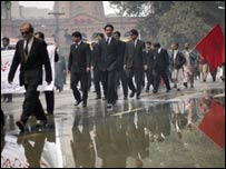 وکلاء کے جلوس کی وجہ سے کڑے حفاظتی انتظامات کیے گئے اور جلوس کی گزرگاہ مال روڈ کو جانے والے راستوں کو رکاوٹیں کھڑی کرکے بند کردیا گیا جبکہ جلوس کے آگے ایلیٹ فورس کی گاڑی چل رہی تھی۔ مظاہرین نے کتبے اور بینرز اٹھا رکھے تھے جس پر عدلیہ کے حق اور صدر پرویز مشرف کے خلاف عبارتیں درج تھیں جبکہ وکلاء نے پی سی او نامنظور اور زندہ ہیں وکلاء زندہ ہیں کے نعرے لگائے۔ جلوس کے راستے میں دکانیں کھلی رہیں اور مظاہرین مال روڈ پر مسلم لیگ قاف کے امیدواروں کے بینرز کو اتار کر پھاڑتے رہے۔ پنجاب اسمبلی کے سامنے وکلاء رہنماؤں نے خطاب کرتے ہوئے حزب مخالف کی سیاسی جماعتوں پر زور دیا کہ وہ وکلاء تحریک میں شامل ہوں۔ اس موقع پر مظاہرین نے بینظیر بھٹو کے چہلم کے سلسلہ میں ان کے لیے دعا کی جس کے بعد وکلاء پرامن طور پر منتشر ہوگئے۔ | اسی بارے میں ’جمہوریت کے لبادے میں ڈکٹیٹر‘01 February, 2008 | پاکستان پاکستان میں وکلاء کا یومِ افتخار 30 January, 2008 | پاکستان فوج کی سوچ بدلنا ہو گی: منیر ملک24 January, 2008 | پاکستان پاکستان میں وکلاء کا ’یومِ افتخار‘ 31 January, 2008 | پاکستان وکلاء ریلی، لاٹھی چارج، چھ زخمی24 January, 2008 | پاکستان پاکستان اور بین الاقوامی اعزازات24 January, 2008 | پاکستان | ||||||||||||||||||||||||||||||||||||||||