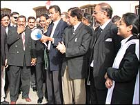 اس قافلے میں شریک سپریم کورٹ بار کے سابق صدر معروف قانون دان منیر اے ملک نے بی بی سی اردو ڈاٹ کام سے بات کرتے ہوئے کہا کہ انتخابات میں جمہوری قوتوں کی کامیابی ہوئی ہے اور وکلاء کی جدو جہد اپنے منطقی انجام کو پہچنے گی۔ منیر اے ملک کا کہنا تھا کہ ’جمہوری طاقتیں عدلیہ کی آزادی کے حق میں ہیں۔ جب بھی یہ اشارہ ملتا ہے کہ ایوان اقتدار میں کوئی اور فیصلہ کیا جارہا ہے تو ہم لانگ مارچ کے لیے تیار بیٹھے ہیں۔‘ ان کا کہنا تھا کہ بیرونی دباؤ بہت ہے، توڑ جوڑ باہر کی طاقتیں کر رہی ہیں مگر وکلاء کو یقین ہے کہ عوام کا جمہوری مینڈیٹ کامیاب ہوگا۔اس مینڈیٹ کی جڑ آزاد عدلیہ ہے اور وہ آزاد عدلیہ تین نومبر سے پہلے کی ہے۔‘ ہائی کورٹ بار کے رہنما رشید رضوی کا کہنا تھا ہے کہ حیدرآباد بار نے جج صاحبان کو دعوت دی تھی، وکلاء ان کے ساتھ یکجہتی کے لیے جا رہے ہیں مگر اصل جوڈیشل بس نو مارچ سے شروع ہوگی۔ ان کا کہنا تھا کہ بار نے انہیں سندھ ہائی کے حاضر سروس ججوں کے طور پر دعوت دی ہے، وکلاء انہیں ریٹائرڈ جج کے طور پر مخاطب نہیں کرتے۔ رشید رضوی کا کہنا تھا کہ حکمران آنکھیں نہیں کھول رہے اور اگر وہ نہ جاگے تو ڈر یہ ہے کہ اکہتر کی تاریخ نہ دہرائی جائے۔ جسٹس افتخار محمد چودھری معزول کیے جانے کے بعد پہلی مرتبہ سکھر اور حیدرآباد میں بار کو خطاب کرنے کے آئے تھے تو ہائی کورٹ کے جج صاحبان نے شرکت کرکے حکومت کو پریشان کردیا تھا۔ تجزیہ نگاروں کا کہنا ہے کہ اس آزمائشی جوڈیشل بس سے وکلاء عوام اور حکومت کا رخ دیکھنا چاہتے ہیں۔ |